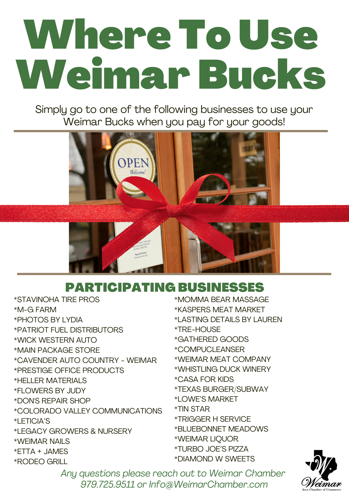 For more information about the gift certificate program, contact us at (979)725-9511 or Info@WeimarChamber.com